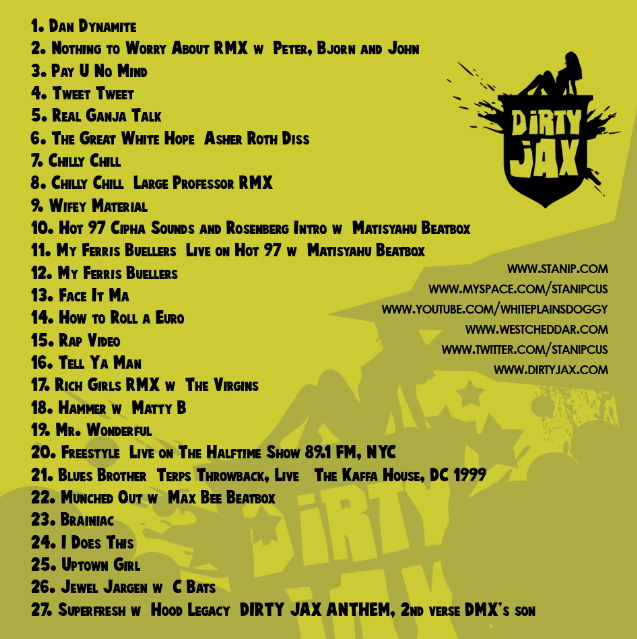 Here it is. DIRTY JAX PRESENTS THE BEST OF STAN IPCUS. Yeah, that’s a new Dirty Jax spring 2009 shirt I’m wearing, and their designer Josh Kimerling put the cover artwork together for me. As I said last week in my promo post, this mixtape features a bunch of my favorite material from my last three projects, and some new remixes (shout out to the great Large Professor thanks for the remix!!!!), radio appearances, leaks, etc. Check below for the tracklist and free download link. Enjoy.