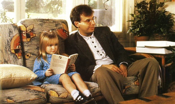 The first Dad I’d like to give props to is Rick Moranis’ nerdie character in the movie Parenthood, Nathan Huffner. Remember this dude? So funny. I grew up watching this movie over and over as a kid, and Nathan Huffner popped into my head the other day and I started cracking up out loud to myself thinking of how outrageous he was. Throughout the whole movie, he’s constantly teaching his daughter Patty, who’s probably about three years old, about the square root of numbers, martial arts, foreign languages, and other subjects she’s obviously way too young to be learning about. I mean, look at the picture above. She’s reading Franz Kafka!!!! And it should be noted too that he has a hot wife. Here’s some funny Nathan Huffner quotes from Parenthood…